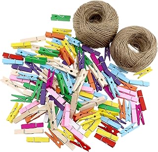 OTOTEC Lot de 120 pinces à linge en bois avec 2 rouleaux de ficelle de jute, mini pinces à linge multicolores couleur naturelle
