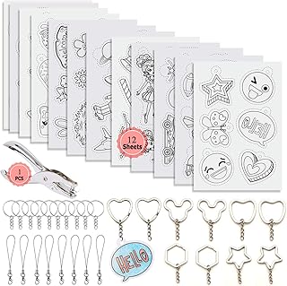 Queta Kit de Feuille de Plastique, Chaleur Shrinky Feuilles Creative Inclure 6 Papier d'art rétractable avec Motif et 6 Papier d'art rétractable (Couleur aléatoire), Perforateur, Porte-Clés